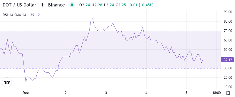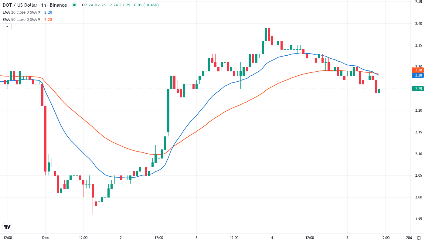 Price action through the EMA ribbons paints a decisively bearish picture – DOT currently trades below every single moving average from the 10-day ($2.29) all the way up to the 200-day (not visible on daily charts but sitting around $4.10). Most critically, the 20-day EMA at $2.40 has flipped from support to resistance after price crashed through it last week, while the 50-day EMA looms higher at $2.74 as a more substantial barrier. The compression between current price at $2.25 and the 10-day EMA at $2.29 suggests any bounce attempt will face immediate selling pressure.