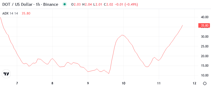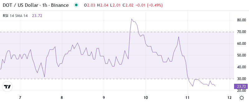 Reading the oscillator at 36.73 on the daily timeframe, traders see momentum conditions that haven’t appeared since August’s brutal selloff that marked the yearly low. This oversold reading typically signals either an imminent relief bounce or continued waterfall decline – and historically, DOT has bounced from sub-40 RSI levels roughly 70% of the time over the past two years.
