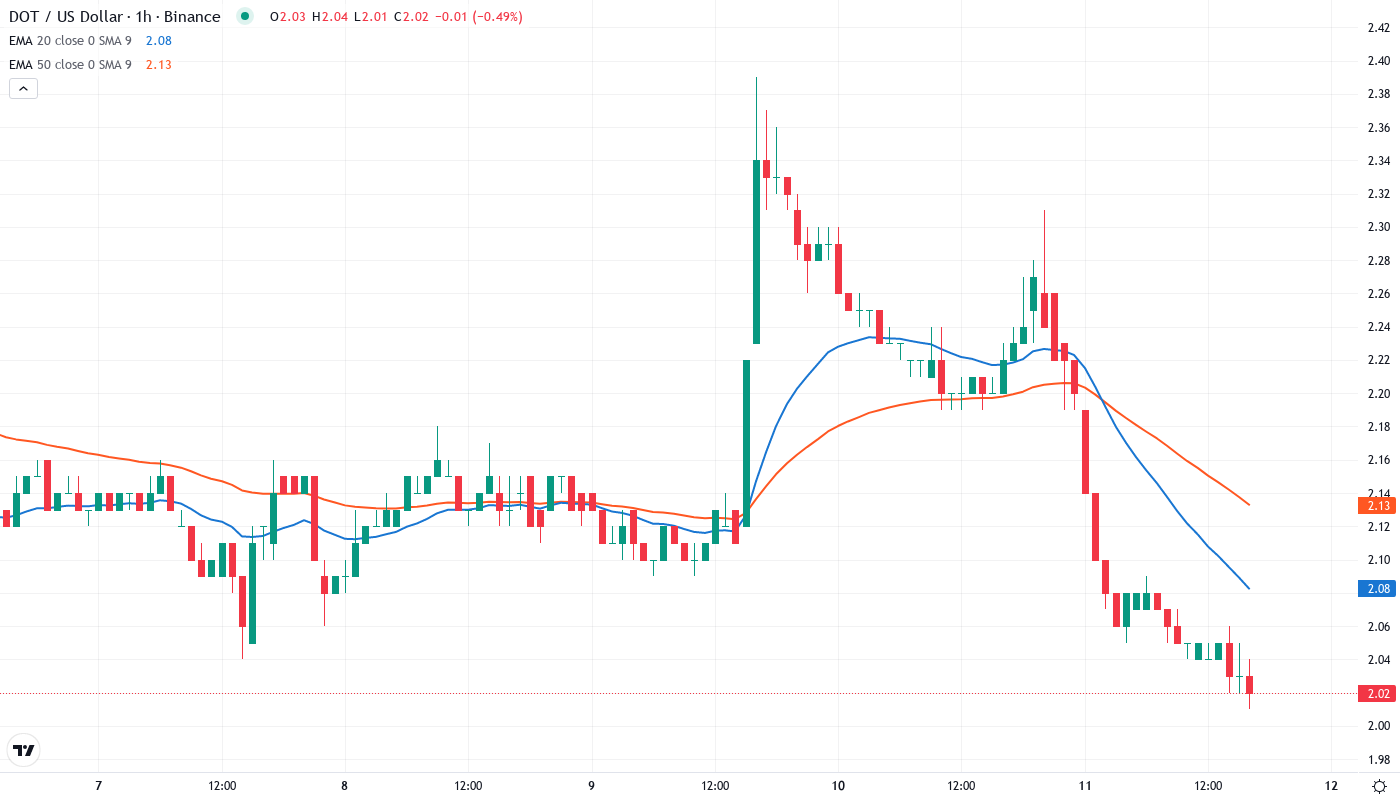 Given the mature downtrend, deeply oversold conditions, and proximity to major support, the highest probability scenario sees DOT attempting a relief bounce toward $2.20-2.40 before sellers reassert control. Any sustained recovery requires both holding $2 and seeing genuine institutional flows from the ETF listing – neither of which looks imminent based on current price action.