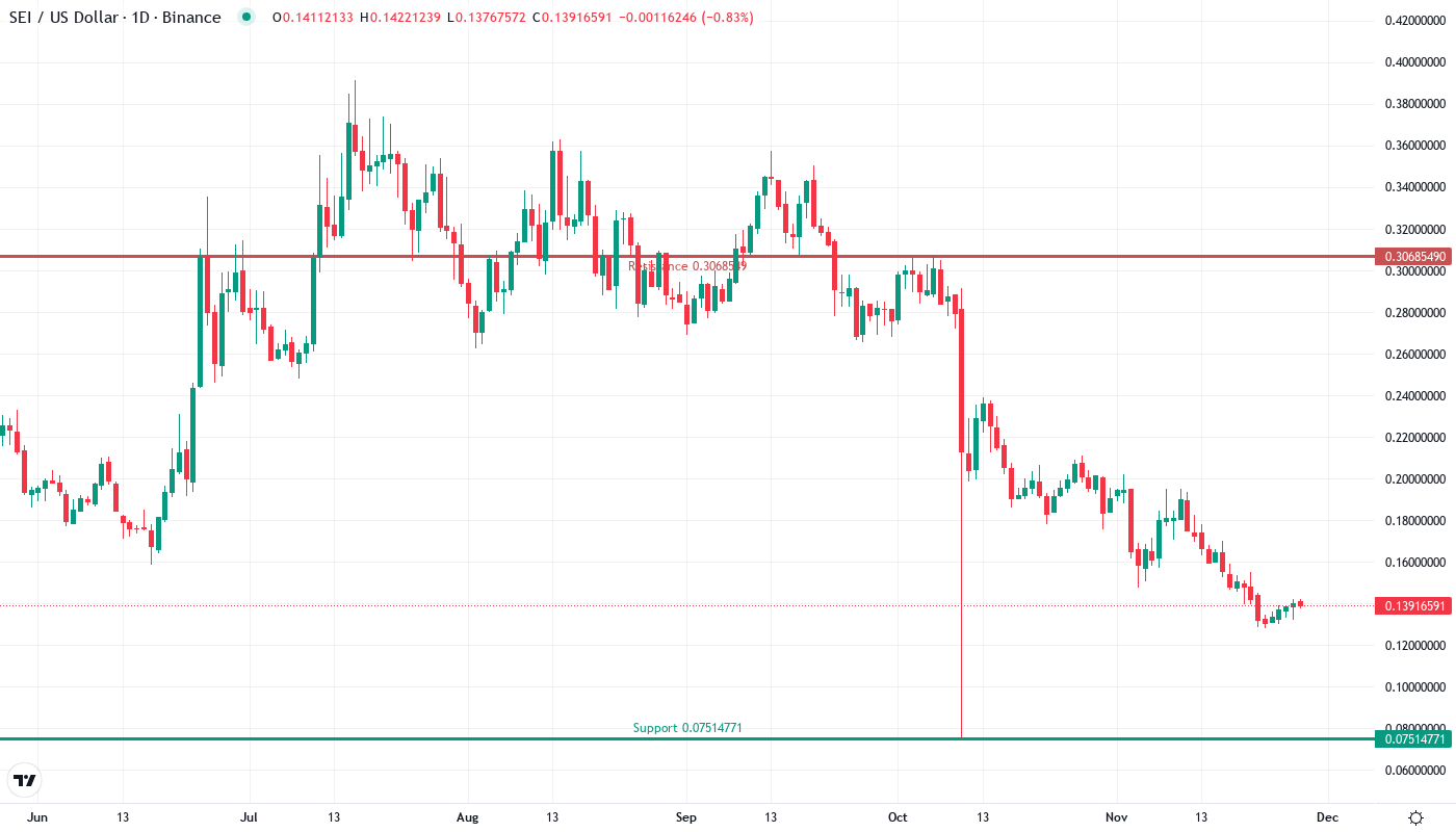 - SEI trades at $0.138, down 31% monthly despite Binance listings expanding access