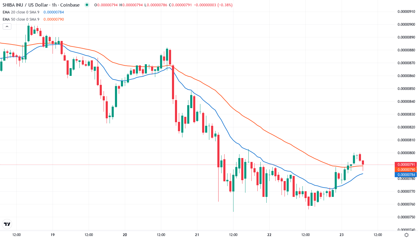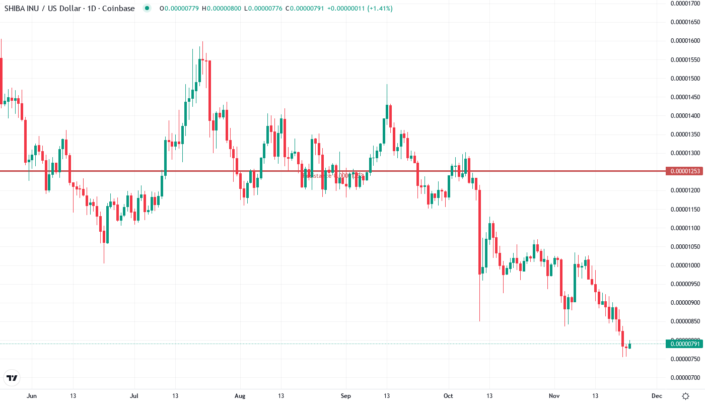 Shiba Inu has shed 21.8% over the past month, with price action telling a stark story of bearish dominance even as major exchanges rolled out regulated futures trading. The meme coin currently trades at $0.00000791, down from November’s $0.0000101 peak, as institutional product launches from Coinbase and Gemini failed to stem the selling pressure. What’s particularly revealing is how SHIB rejected advances at the 20-day EMA three times this week – a textbook sign of sellers defending overhead resistance. The main question for traders is: will the much-tested $0.00000754 monthly low hold, or are bears positioning for a deeper flush toward the psychological $0.0000070 level?
