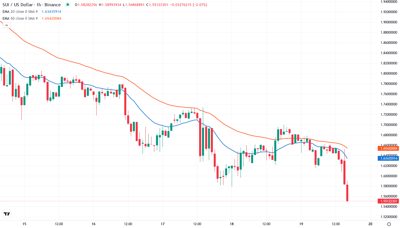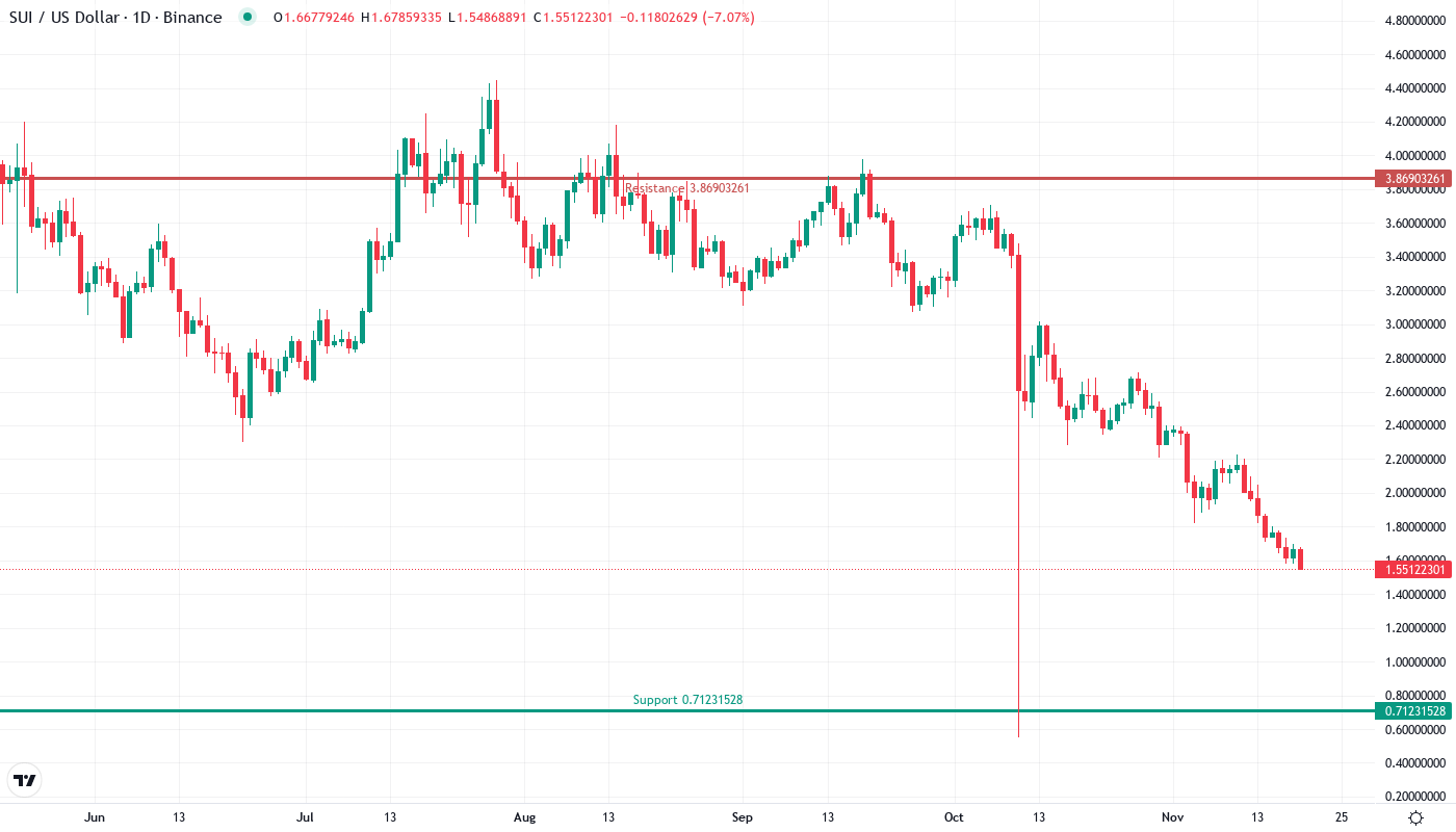 Sui’s price action tells a brutal story of broken promises and shattered support levels. The token has collapsed 60% from its October peak, currently changing hands at $1.55 despite a flurry of positive developments including record-breaking DEX volumes for three consecutive quarters and expansion into real-world payments through Travala. What started as a controlled pullback in November accelerated into a devastating drop that erased months of gains in weeks. The main question for traders is: does the confluence of extreme oversold readings and major support at $1.55 mark the capitulation bottom, or will the selling pressure that overwhelmed positive fundamentals continue to new lows?