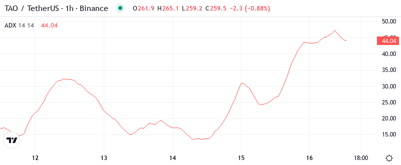 At the level of 18.48, the ADX entry indicates that TAO has shifted from trending to choppy conditions following December’s directional move. The trend strength indicator peaked above 40 during the November rally, then steadily declined as price action compressed into the current $260-$340 range. Basically, being in this zone below 20 means neither bulls nor bears control the tape – it’s a trader’s market rather than an investor’s market.