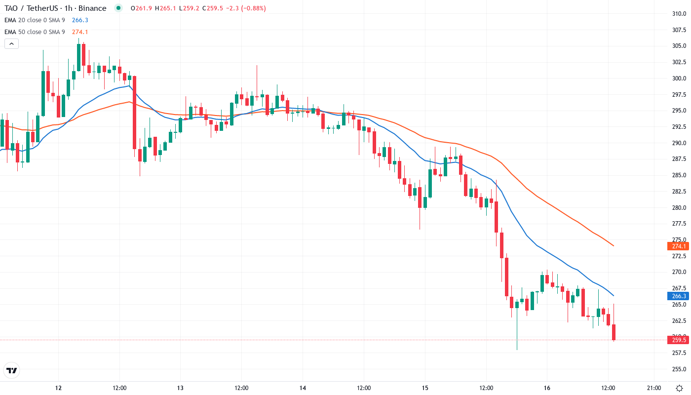 Given the oversold RSI, support holding at $260, and the halving’s supply dynamics still working through the market, the most probable near-term path is for TAO to build a base between $260-$300 before attempting to reclaim the 50-day EMA. The reduced issuance should gradually shift the supply/demand balance, but markets need time to adjust to new equilibrium levels post-halving.