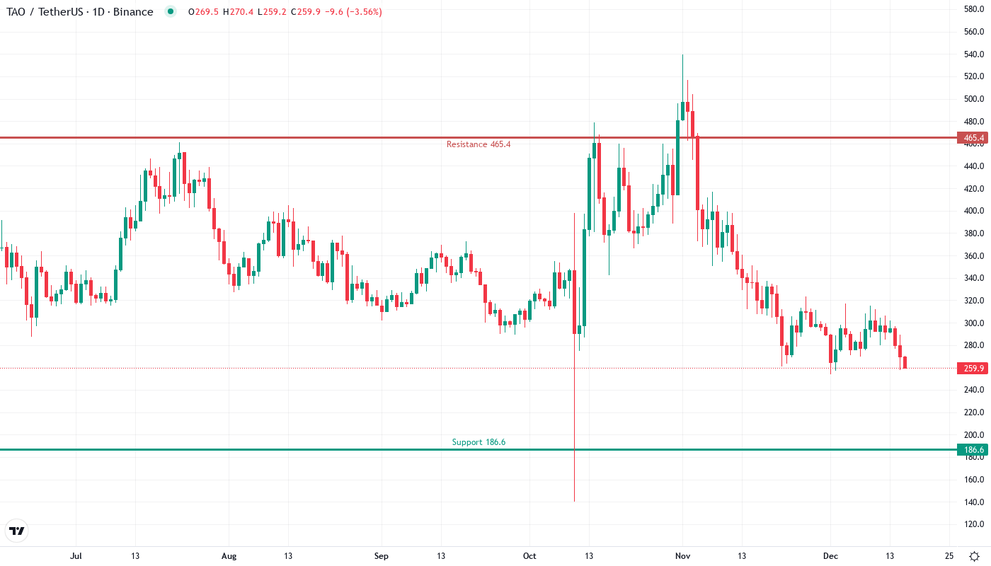 Bittensor’s TAO has shed $75 from December highs, tumbling 22.5% over the past month as the market digests the protocol’s first halving event. The token’s issuance reduction by half triggered an initial sell-the-news reaction, with price sliding from $337 to test critical support at $260 – a level that’s attracted buyers consistently since October. The main question for traders is: will this halving-driven supply shock provide the catalyst for a recovery, or does TAO need deeper capitulation before finding a sustainable bottom?