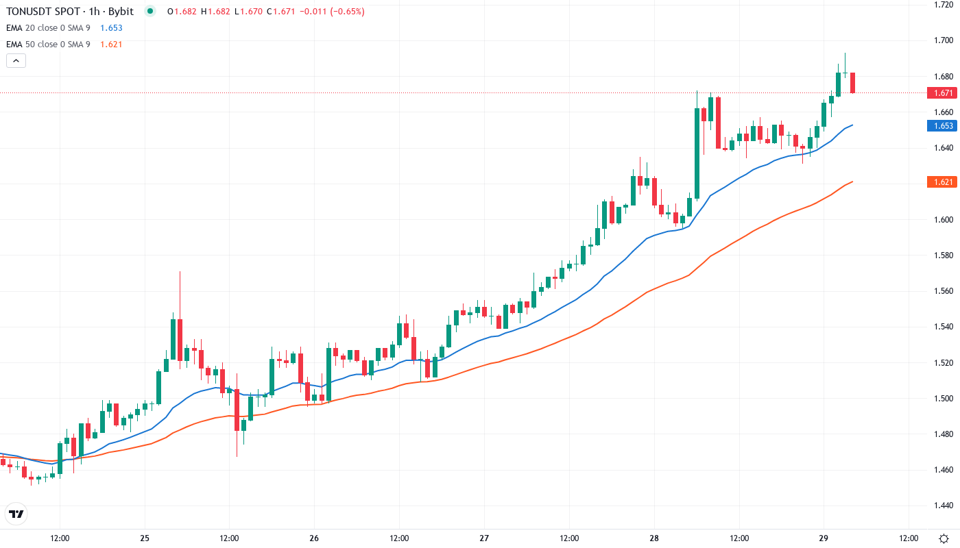- The TON/USDT price is $1.675 as of writing, down 37.9% from the record high reached in late December.