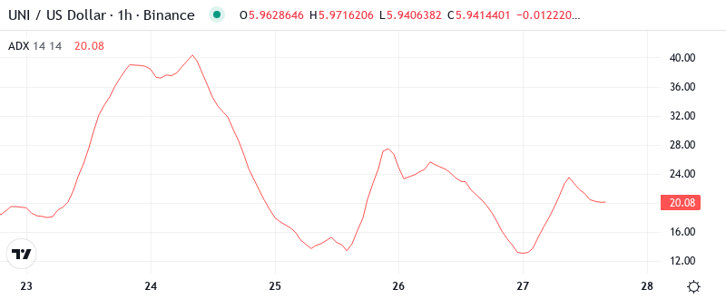 When it comes to trend strength, the ADX reads 17.41, which is well below the 25 threshold differentiating between trending and choppy markets. A low reading like this backs up what the price action is already detailing – UNI is stuck within a consolidation phase ranging between $5.74 support and $6.50 resistance and there’s no clear bias from the bulls or the bears.