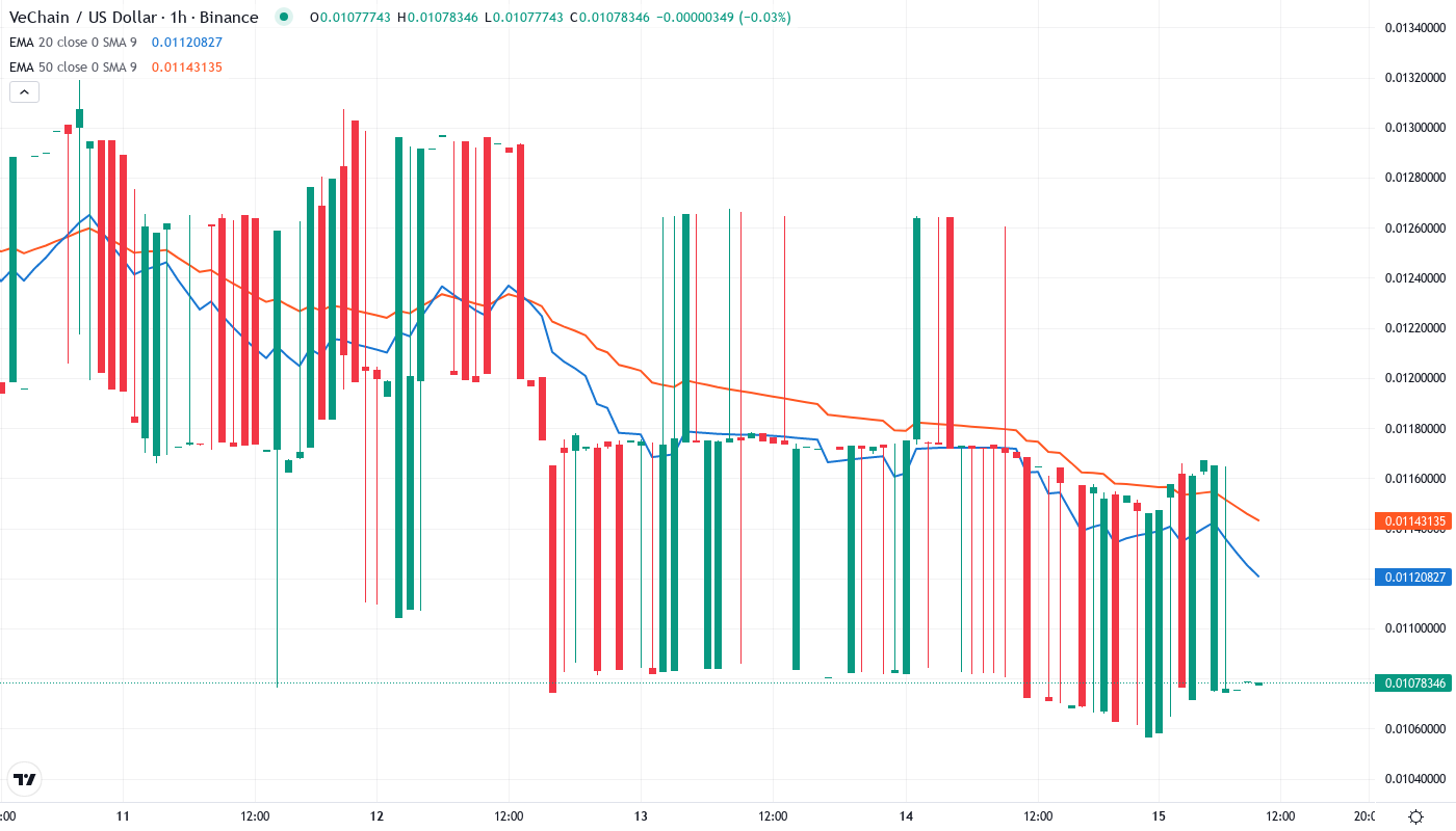 Price action tells a grim story through the moving average structure. VET currently trades at $0.01078, trapped beneath the entire EMA stack – from the 10-day ($0.01169) through the 200-day ($0.02798). Most damaging is the loss of the 50-day EMA at $0.01440, which had supported price through three separate tests in Q3 before finally cracking under Hayabusa-induced selling pressure.