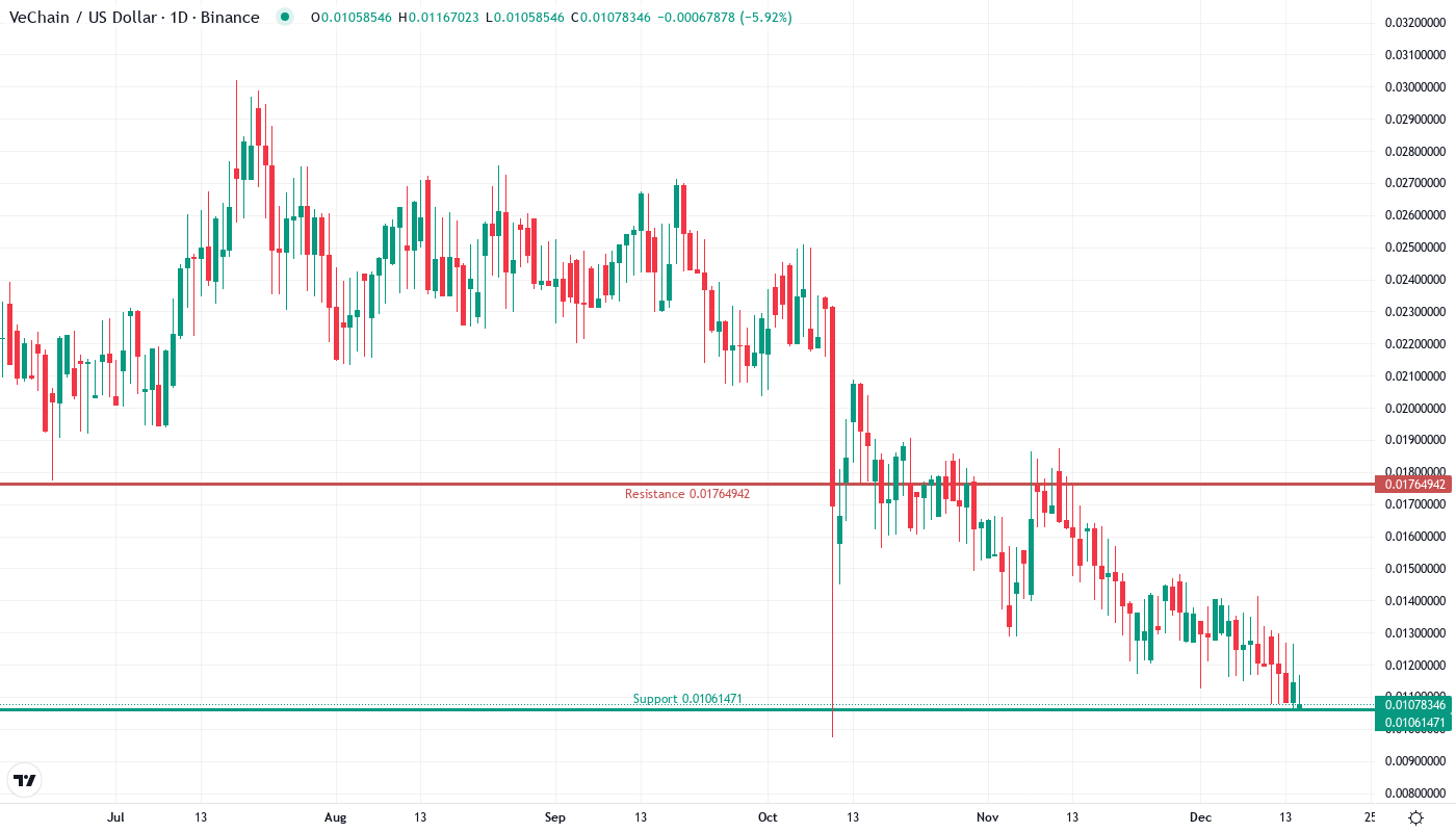 The bearish scenario triggers if $0.01078 support crumbles on volume. That breakdown would likely cascade toward $0.0075 as stop-losses from six months of accumulation positions activate. More concerning, the elimination of passive rewards removes a key price floor that historically cushioned VET during market downturns.