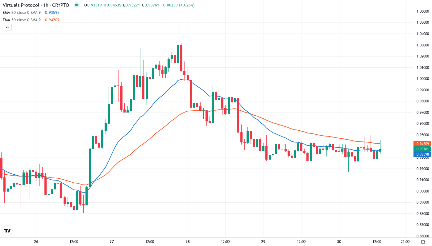 Price action tells a compelling story through the EMA ribbons. VIRTUAL currently trades at $0.937, positioned below the 10-day ($0.969), but more importantly, it faces a cluster of resistance where the 20-day EMA at $1.22 converges with the 30-day at $1.077. This configuration changed dramatically after the Coinbase DEX integration – what was support during December’s rally has now flipped to resistance, creating a clear ceiling that bulls must overcome to confirm the recovery has legs.