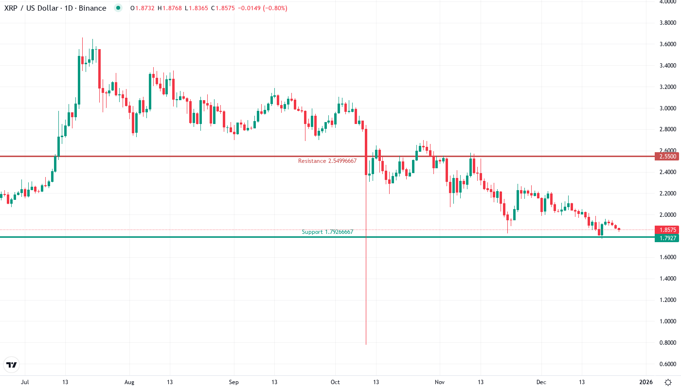 Bulls are trying to defend several support levels underneath, yet all are beginning to weaken. The first line of defense is at $1.86, which is current levels, as the monthly S1 pivot acts as a short-term prop. Below that sits the psychological $1.80 level, along with November’s rebound zone, which is essential in preserving any bullish framework. The monthly S2 pivot of $1.43 is in the vicinity of the 200-day EMA of $1.32, and would likely be the target of ultimate despair if panic liquidation increases.